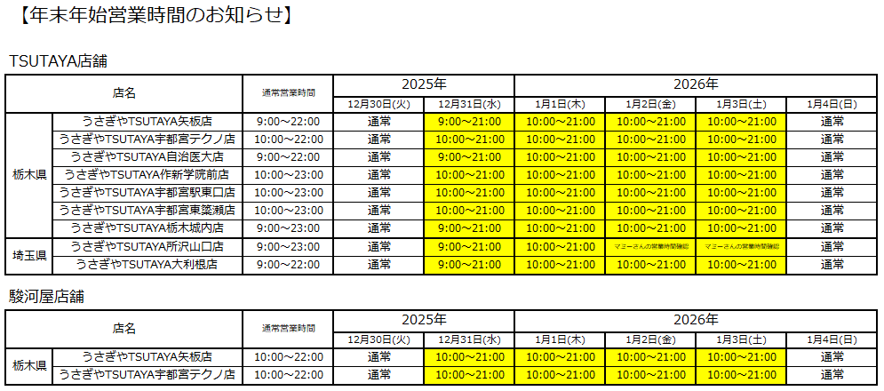 年末年始は営業時間が異なりますので、ご確認の程宜しくお願い致します。